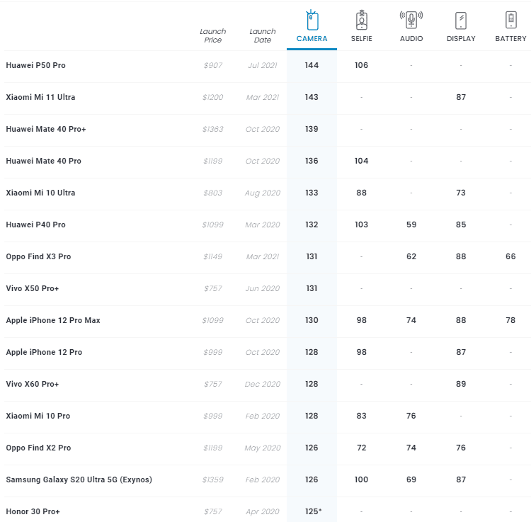 Στην κάτωθι εικόνα, μπορούμε να δούμε τα κορυφαία smartphone της αγοράς με τις καλύτερες επιδόσεις στον τομέα της φωτογραφίας, σύμφωνα με τις επίσημες μετρήσεις του DxOMark.
