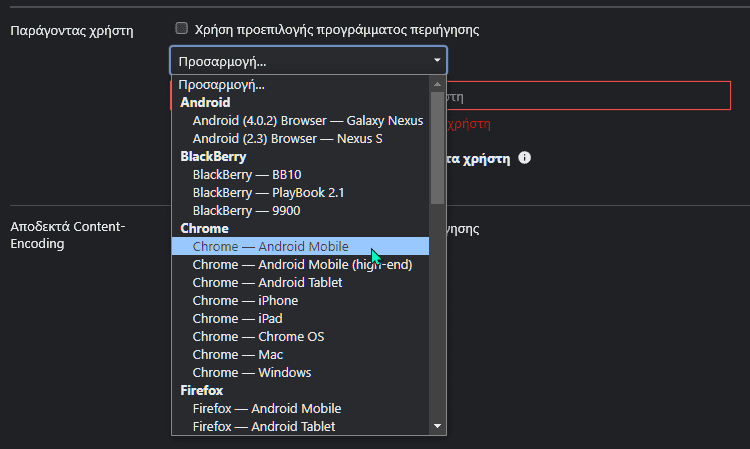 Από εκεί και μετά, απλά επιλέγουμε τον browser που θέλουμε να πλαστογραφήσουμε καθώς και το λειτουργικό σύστημα.