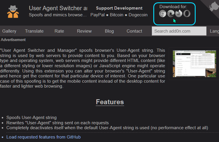 Ο πιο εύκολος και πιο αποτελεσματικός τρόπος για την αλλαγή της συμβολοσειράς του user agent σε όλους σχεδόν τους browser πλην του Safari, είναι η επέκταση User Agent Switcher and Manager.